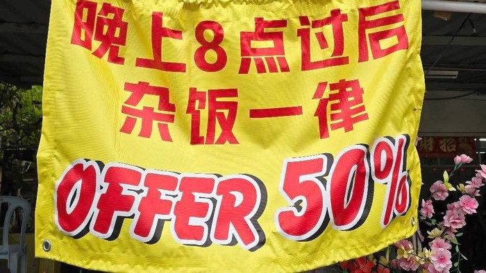 Di sejumlah kedai nasi campur di kawasan Lembah Klang, Malaysia, ada beberapa kedai yang mengadakan diskon potongan harga 50% untuk semua makanan setelah pukul 20.30.