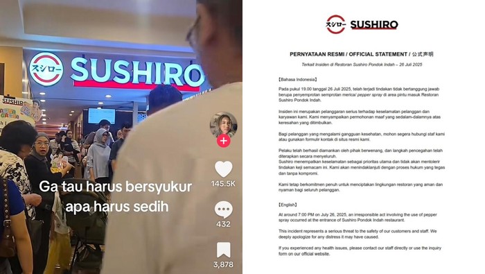 Heboh! Insiden mengejutkan terjadi di gerai sushi terkenal di Pondok Indah Mall, Jakarta Selatan. Seorang remaja ‘iseng’ semprotkan pepper spray ke dalam restoran, menyebabkan pengunjung diminta keluar dan makanan digratiskan. Bukan hanya itu, video kejadian ini viral di media sosial, seperti yang diposting oleh akun @chicashareseverything pada 27 Juli 2025.